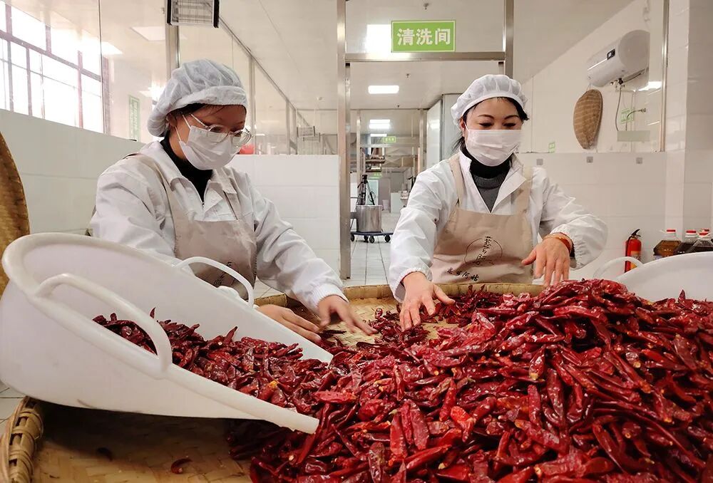 殷岚作为殷氏油辣椒制作技艺的传承人,抓住传承“非遗”技艺契机,将兴仁特色薏仁菇融入油辣椒中,地道的兴仁油辣椒颇受市场喜爱。走进贵州薏芗阿姑食品有限公司加工车间,一股浓郁的“辣”香扑鼻而来,工人们分工协作,有的正忙着挑拣、淘洗、浸泡、粉碎干辣椒,有的则准备香料,炼制香油。火红的辣椒随着搅拌器在香油中沸腾、翻滚,嗞嗞作响,让人垂涎欲滴。