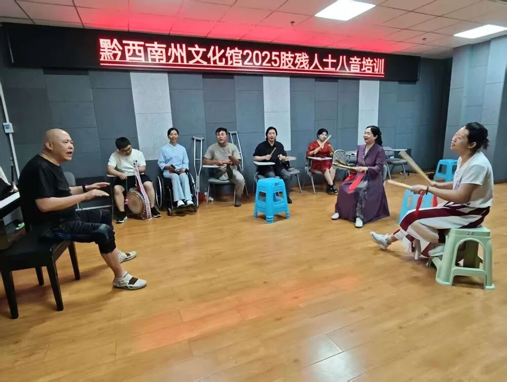 黔西南州文化馆特别面向肢残人士开设声乐培训班、八音坐唱培训班。老师们耐心传授乐理知识、合唱技巧、器乐演奏方法,肢残人士克服身体不便,认真学习,用歌声和演奏表达对生活的热爱。